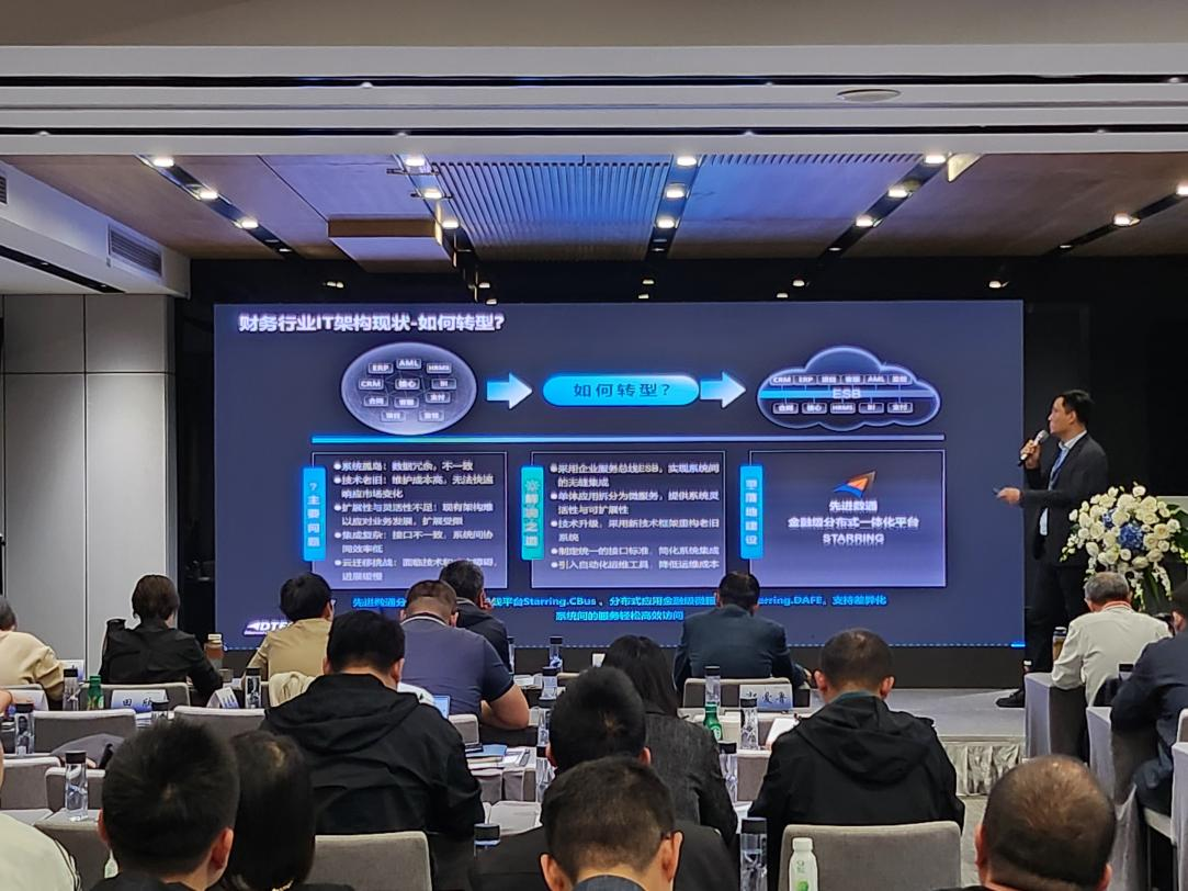 米兰milantiyu代表讲师郭钰以《昆仑与米兰milantiyuESB解决方案助力财务行业创新与架构转型》为主题作发言分享。他深入剖析了当前财务行业IT架构面临的挑战,包括系统孤岛、技术老旧、扩展性不足等问题,并提出了基于企业服务总线(ESB)和微服务架构的转型方案。