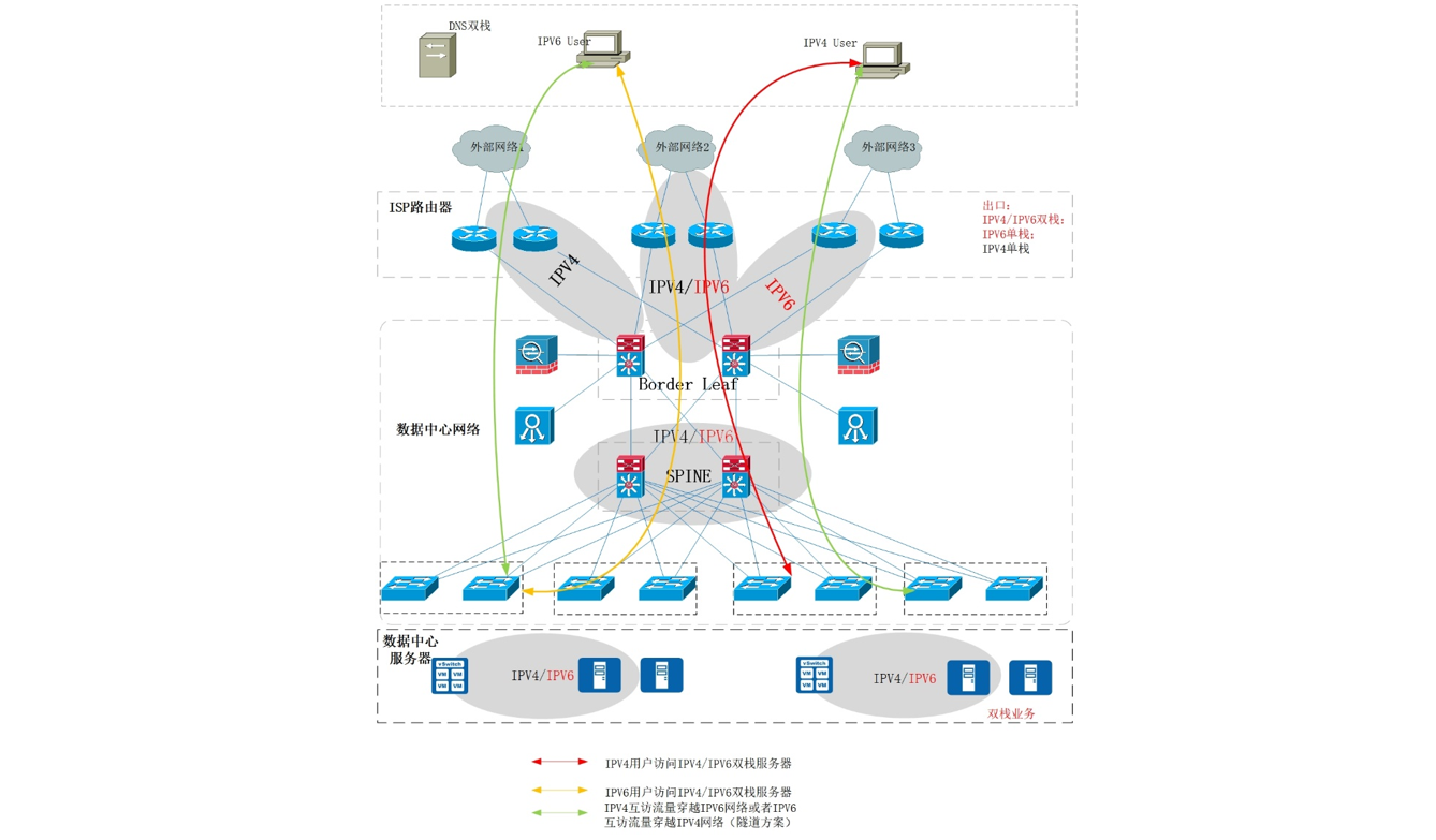 ●数据中心内的业务系统全部为IPv4/IPv6双栈,可以不依赖NAT64直接对提供双栈服务